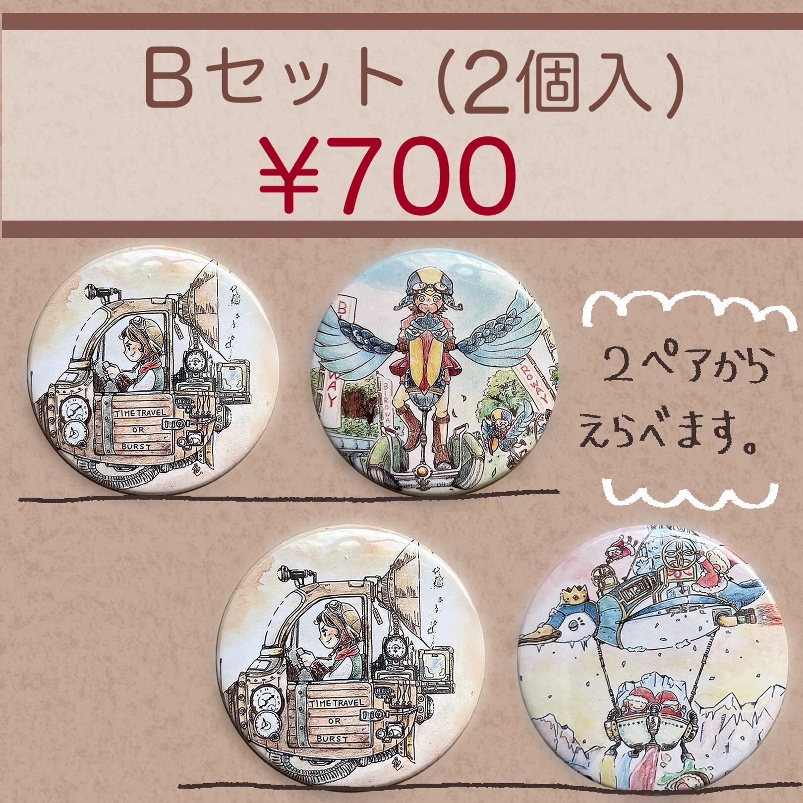 オリジナルイラストの缶バッジ。